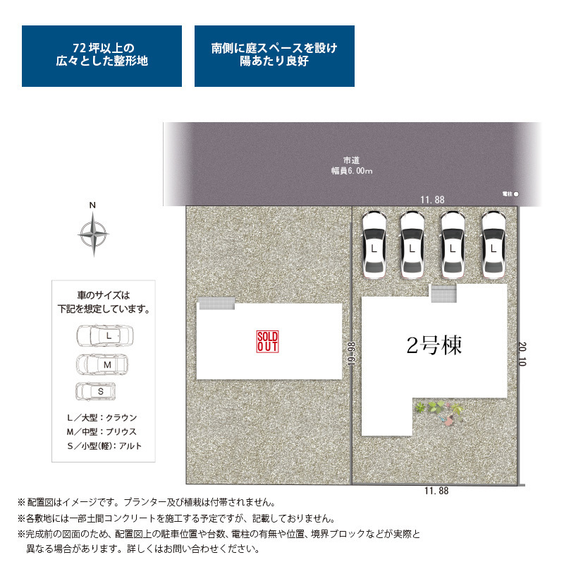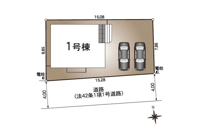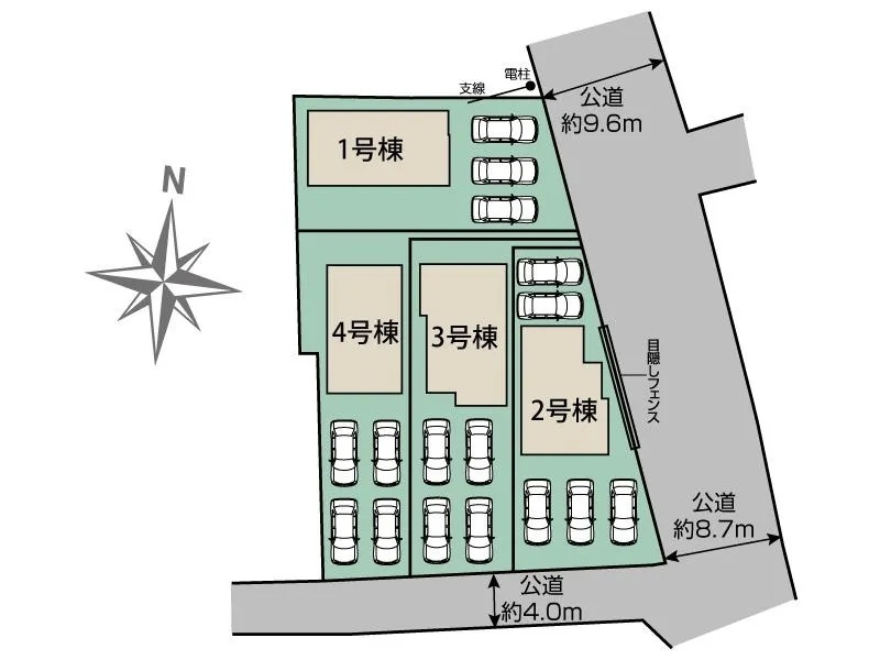 ◯所在地/静岡県磐田市高木60-1 ◯交通/JR東海道本線「磐田」駅、バス6分、バス停「高木」徒歩1分 ◯総区画数/4区画 ◯販売棟数/4棟 ◯土地権利/所有権 ◯土地面積/200.00㎡~200.02㎡ ◯建物面積/104.89㎡~108.68㎡ ◯建築確認番号/第R07SHC121476号 ◯構造/木造サイディングシングル葺2階建て ◯都市計画/市街化調整区域 ◯用途地域/無指定 ◯建ぺい率/50% ◯容積率/80% 設備/公営水道・中部電力・オール電化・本下水 ◯接道/南側4.0m・東側8.7m ◯完成/2026年3月予定