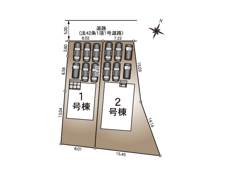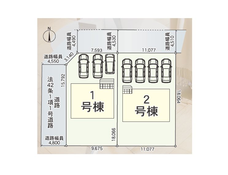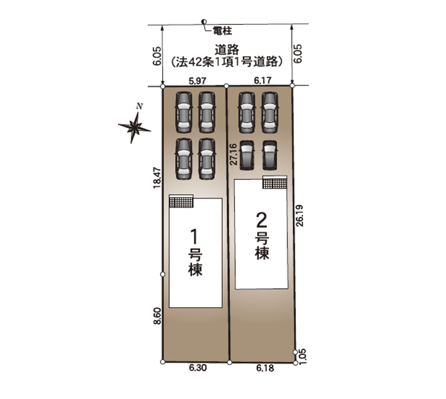 ◯所在地/静岡県磐田市福田5489-66 ◯交通/JR東海道本線「磐田」駅、バス17分、バス停「新道」徒歩16分 ◯総区画数/2区画 ◯販売棟数/2棟 ◯土地権利/所有権 ◯地目/宅地 ◯土地面積/207.52㎡・283.59㎡ ◯建物面積/108.54㎡・82.62㎡ ◯建築番号/第R07SHC116952号 ◯構造/木造スレート葺又はアスファルトシングル葺1階・2階建て ◯都市計画/市街化区域 ◯用途地域/第一種住居地域 ◯建ぺい率/60% ◯容積率/200% 設備/公営水道・中部電力・本下水・個別プロパンガス ◯接道/北側5.0m ◯完成/2026年1月予定