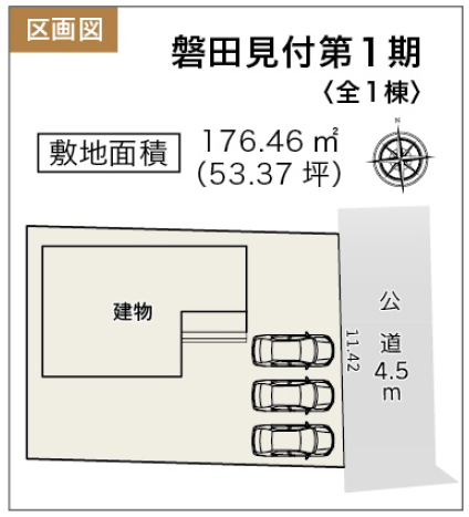 ◯所在地/静岡県磐田市見付1424-2 ◯交通/東海道本線「磐田」駅、バス16分、バス停「茨木」徒歩7分 ◯総区画数/1区画 ◯販売棟数/1棟 ◯土地権利/所有権 ◯地目/宅地 ◯土地面積/176.46㎡ ◯建物面積/105.78㎡ ◯確認建築番号/第KS125-0410-55108号 ◯構造/木造在来軸組工法2階建て ◯土地計画/市街化区域 ◯用途地域/第一種中高層住居専用地域 ◯建ぺい率/60% ◯容積率/150% ◯設備/公営水道・中部電力・本下水・都市ガス ◯接道状況/東側4.5m ◯完成/2025年12月予定