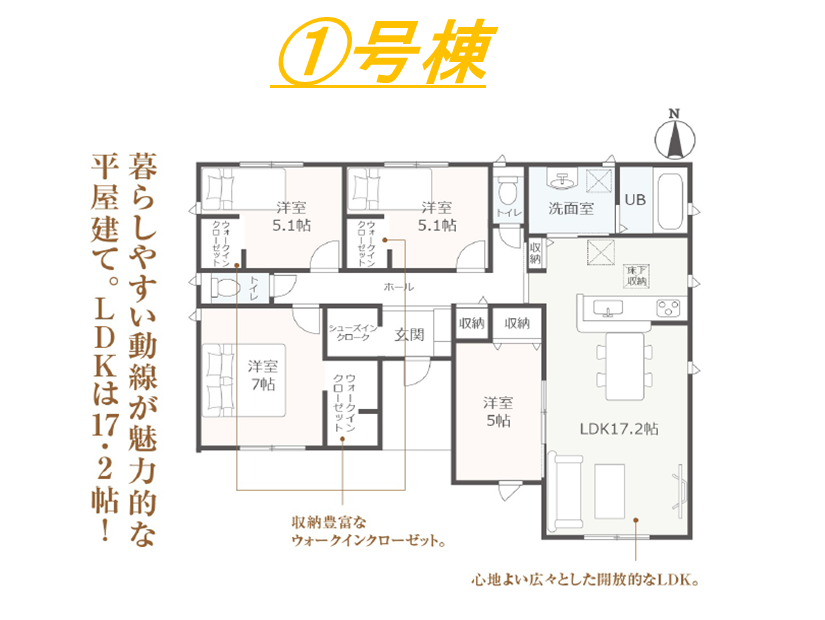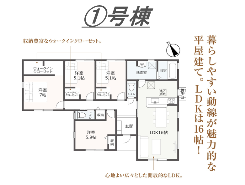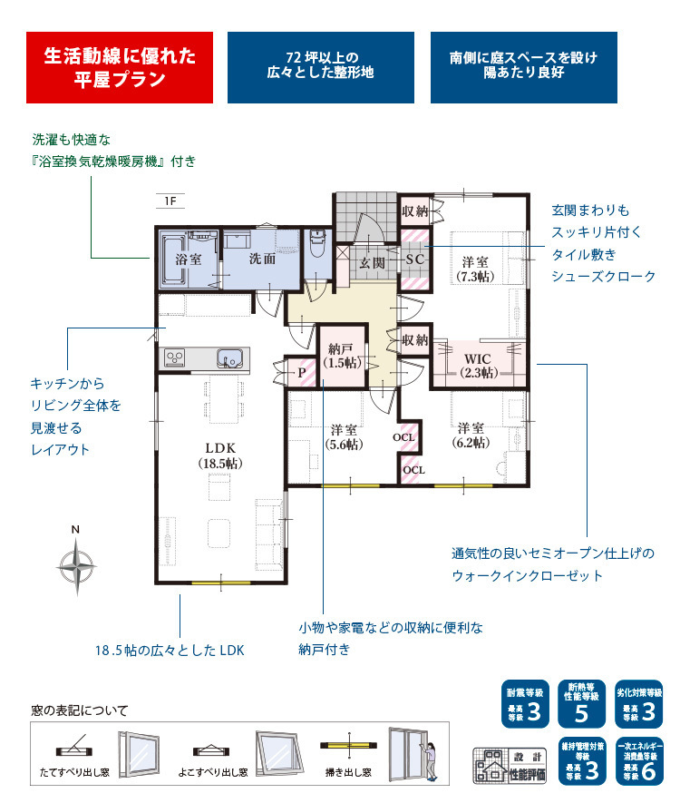 ・対面式キッチン・長期優良住宅・住宅性能表示W取得・耐震等級3・浴室暖房換気乾燥機・TVモニター付インターホン・ウォークインクローゼット・平屋建て