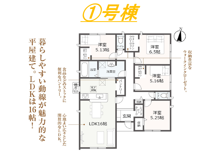 ・対面式キッチン・住宅性能表示W取得・耐震等級3・浴室暖房換気乾燥機・TVモニター付インターホン・ウォークインクローゼット・平屋建て・土間収納・パントリー