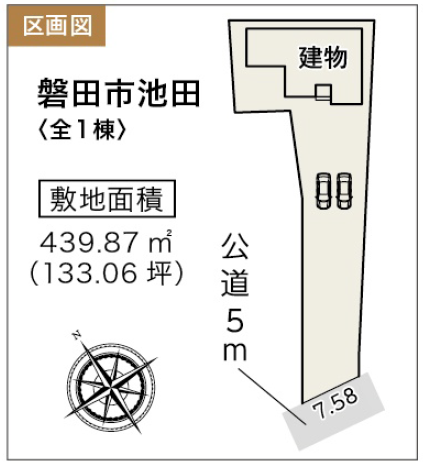 ◯所在地/静岡県磐田市池田316-6 ◯交通/東海道本線「豊田町」駅、車8分 ◯総区画数/1区画 ◯販売棟数/1棟 ◯土地権利/所有権 ◯地目/宅地 ◯土地面積/439.87㎡ ◯建物面積/96.05㎡ ◯確認建築番号/第KS125-0410-55290号 ◯構造/木造在来軸組工法1階建て ◯土地計画/市街化区域 ◯用途地域/第2種中高層住居専用地域 ◯建ぺい率/60% ◯容積率/150% ◯設備/公営水道・中部電力・本下水・個別プロパンガス ◯接道状況/南側5.0m ◯完成/2026年2月予定