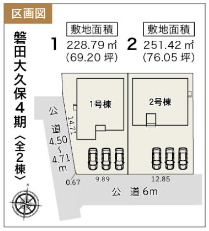 ◯所在地/静岡県磐田市福田3317 ◯交通/JR東海道本線「磐田」駅、バス27分、バス停「福田交番前」徒歩7分 ◯総区画数/2区画 ◯販売棟数/2棟 ◯土地権利/所有権 ◯地目/宅地 ◯土地面積/206.90㎡・207.19㎡ ◯建物面積/98.12㎡・99.36㎡ ◯確認建築番号/第KS125-0420-54839号他 ◯構造/木造在来軸組工法2階建て ◯土地計画/市街化区域 ◯用途地域/第1種住居地域 ◯建ぺい率/60% ◯容積率/200% ◯設備/公営水道・中部電力・本下水・個別プロパンガス ◯接道状況/南側4.0m ◯完成/2026年1月予定