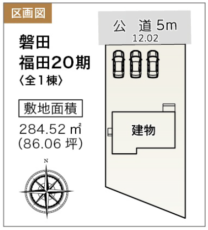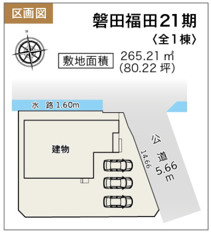 ◯所在地/静岡県磐田市福田3769-5 ◯交通/東海道本線「磐田」駅、車17分 ◯総区画数/1区画 ◯販売棟数/1棟 ◯土地権利/所有権 ◯地目/宅地 ◯土地面積/265.21㎡ ◯建物面積/96.05㎡ ◯確認建築番号/第KS124-0410-54082号 ◯構造/木造在来軸組工法1階建て ◯土地計画/市街化区域 ◯用途地域/第一種住居地域 ◯建ぺい率/60% ◯容積率/200% ◯設備/公営水道・中部電力・本下水・個別プロパンガス ◯接道状況/東側5.6m ◯完成/2025年11月予定