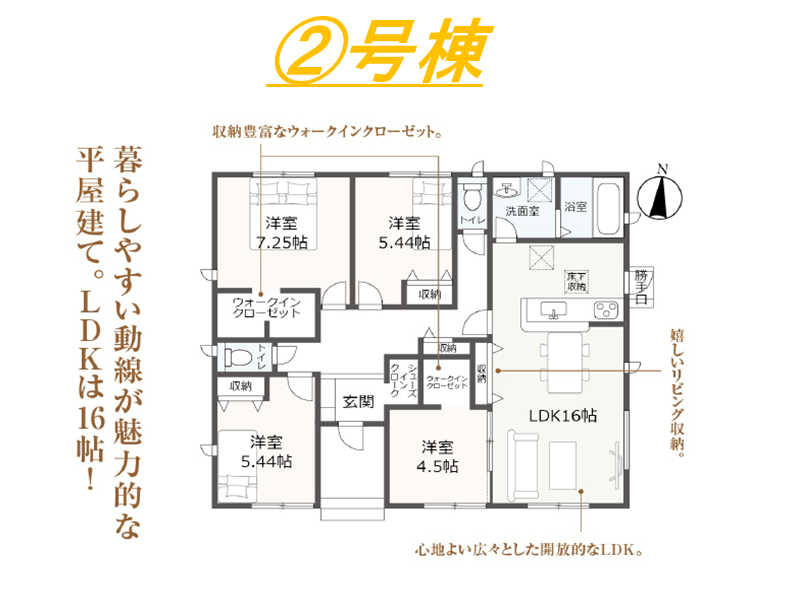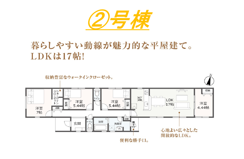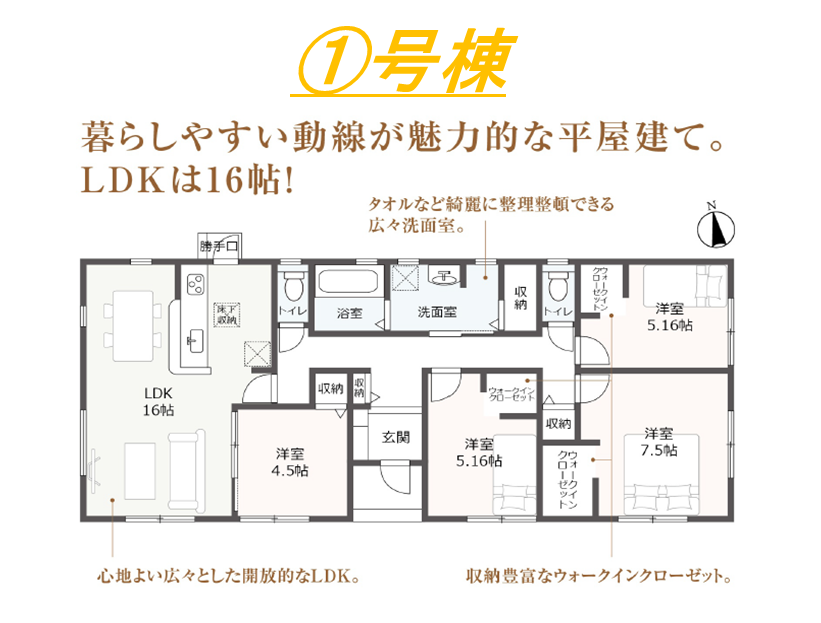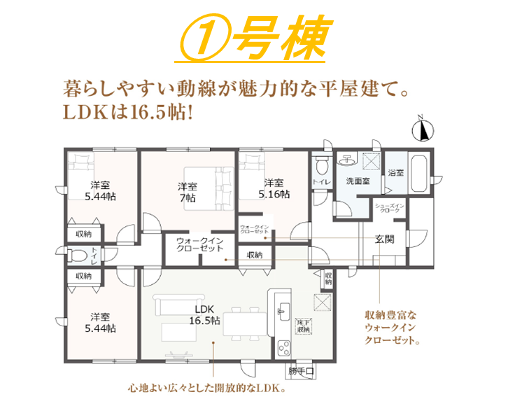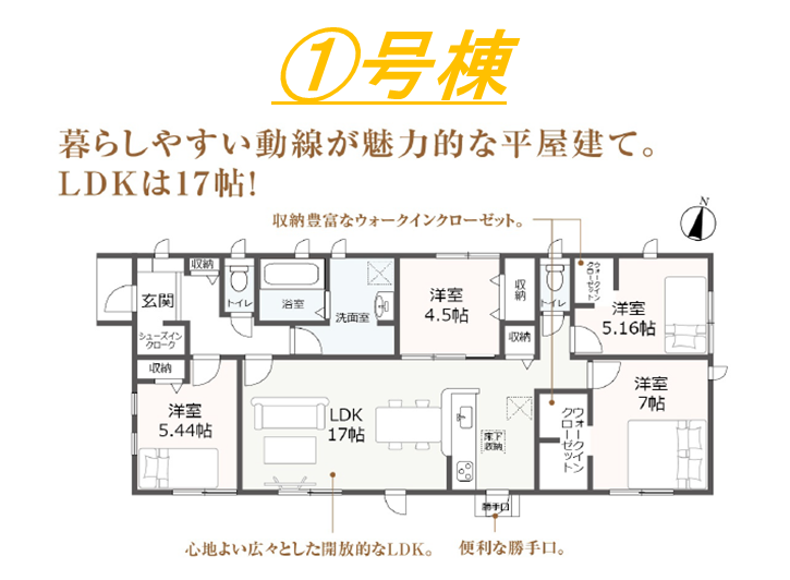 ・対面式キッチン・住宅性能表示W取得・耐震等級3・浴室暖房換気乾燥機・TVモニター付インターホン・ウォークインクローゼット・平屋建て