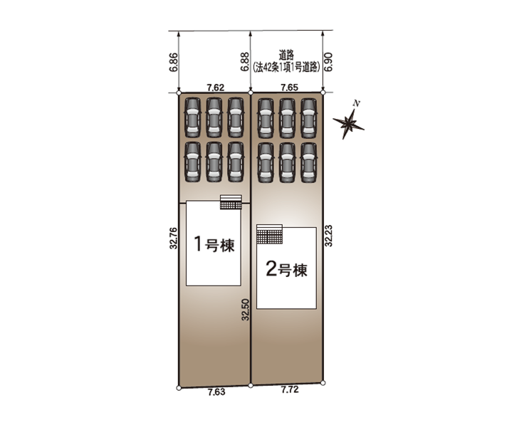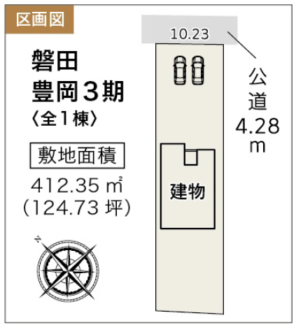 ◯所在地/静岡県磐田市豊岡6417-3他 ◯交通/JR東海道本線「磐田」駅、バス44分、バス停「金洗西」徒歩23分 ◯総区画数/2区画 ◯販売棟数/2棟 ◯土地権利/所有権 ◯地目/宅地 ◯土地面積/183.16㎡・148.23㎡ ◯建物面積/107.72㎡・94.76㎡ ◯建築番号/第R07SHC106080号他 ◯構造/在来木造サイディング貼スレート葺又はアスファルトシングル葺ガルバリウム鋼板横葺2階建て ◯都市計画/市街化区域 ◯用途地域/第一種邸層住居専用地域 ◯建ぺい率/50% ◯容積率/80% 設備/公営水道・中部電力・本下水・都市ガス ◯接道/北(南)側4.0m ◯完成/2025年8月予定