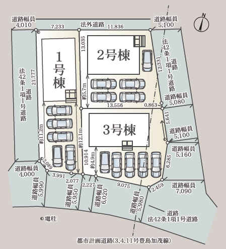 所在地/静岡県磐田市国府台452-1他 ◯交通/JR東海道本線「磐田」駅、バス5分、バス停「新加茂川橋」徒歩16分 ◯総区画数/3区画 ◯販売棟数/3棟 ◯土地権利/所有権 ◯地目/宅地 ◯土地面積/165.30㎡~169.72㎡ ◯建物面積/96.38㎡~98.82㎡ ◯建築番号/第R07SHC116095号 ◯構造/在来木造スレート葺又はアスファルトシングル葺2階建 ◯都市計画/市街化区域 ◯用途地域/第二種中高層住居専用地域 ◯建ぺい率/60% ◯容積率/150% 設備/公営水道・中部電力・都市ガス・公共下水 ◯接道/南側5.9m・東側5.0m・西側4.0m ◯完成/2026年1月予定