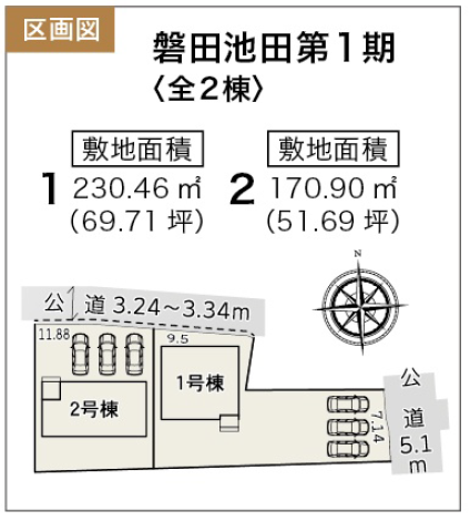 ◯所在地/静岡県磐田市池田833-2 ◯交通/東海道本線「豊田町」駅、車9分 ◯総区画数/2区画 ◯販売棟数/2棟 ◯土地権利/所有権 ◯地目/宅地 ◯土地面積/230.46㎡・170.90㎡ ◯建物面積/111.79㎡・105.99㎡ ◯確認建築番号/第KS125-0420-53654号 ◯構造/木造在来軸組工法2階建て ◯土地計画/市街化区域 ◯用途地域/第2種中高層住居専用地域 ◯建ぺい率/60% ◯容積率/150% ◯設備/公営水道・中部電力・本下水・個別プロパンガス ◯接道状況/東側5.1m・北側3.24m ◯完成/2025年11月予定