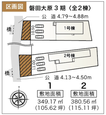 ◯所在地/静岡県磐田市大原978 ◯交通/東海道本線「磐田」駅、車6分 ◯総区画数/2区画 ◯販売棟数/2棟 ◯土地権利/所有権 ◯地目/宅地 ◯土地面積/349.17㎡・380.56㎡ ◯建物面積/95.64㎡・96.05㎡ ◯確認建築番号/第KS125-0410-54995号他 ◯構造/木造在来軸組工法1階建て ◯土地計画/市街化調整区域 ◯用途地域/無指定 ◯建ぺい率/50% ◯容積率/80% ◯設備/公営水道・中部電力・本下水・個別プロパンガス ◯接道状況/西側4.1m ◯完成/2026年1月予定