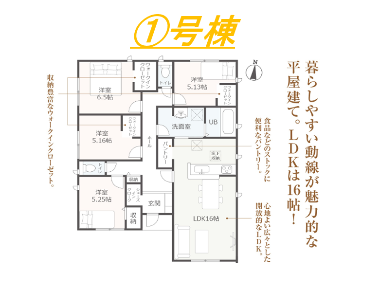 ・対面式キッチン・長期優良住宅・住宅性能表示W取得・耐震等級3・浴室暖房換気乾燥機・TVモニター付インターホン・ウォークインクローゼット・パントリー・土間収納・平屋建て