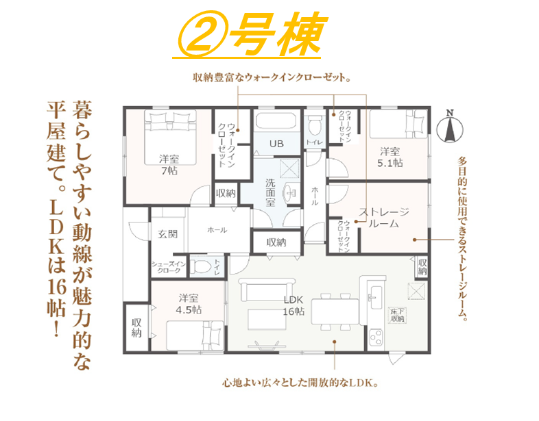 ・対面式キッチン・長期優良住宅・住宅性能表示W取得・耐震等級3・浴室暖房換気乾燥機・TVモニター付インターホン・ウォークインクローゼット・土間収納・ストレージルーム・平屋建て