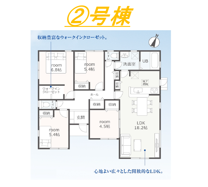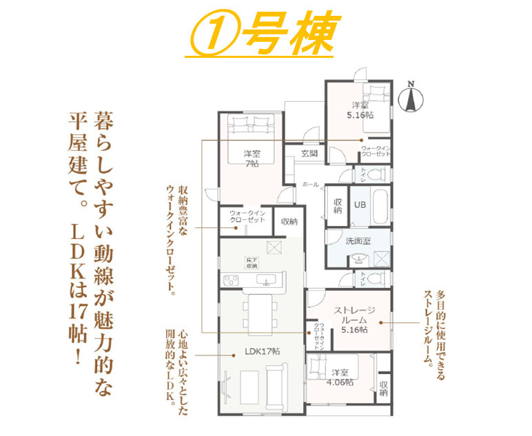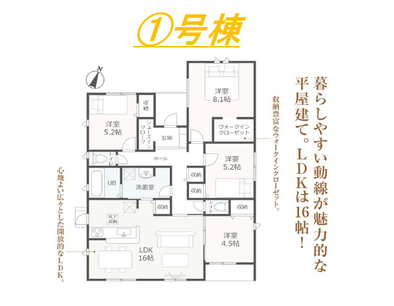 ・対面式キッチン・住宅性能表示W取得・耐震等級3・浴室暖房換気乾燥機・TVモニター付インターホン・ウォークインクローゼット・ストレージルーム・平屋建て