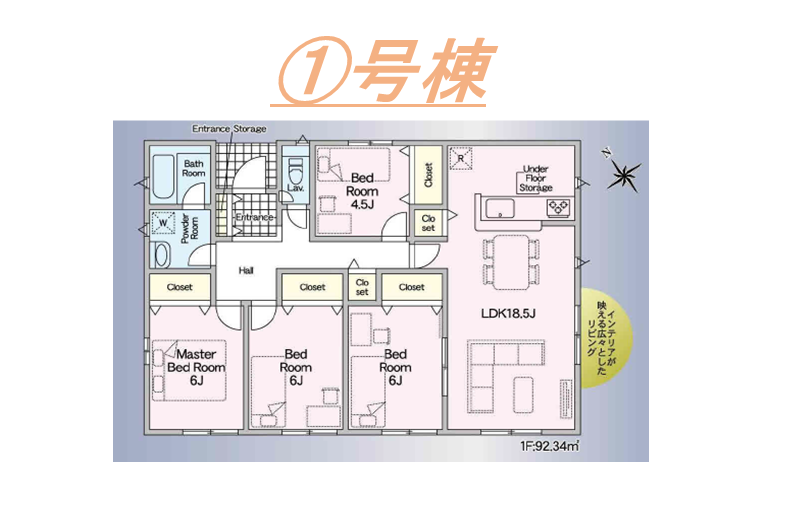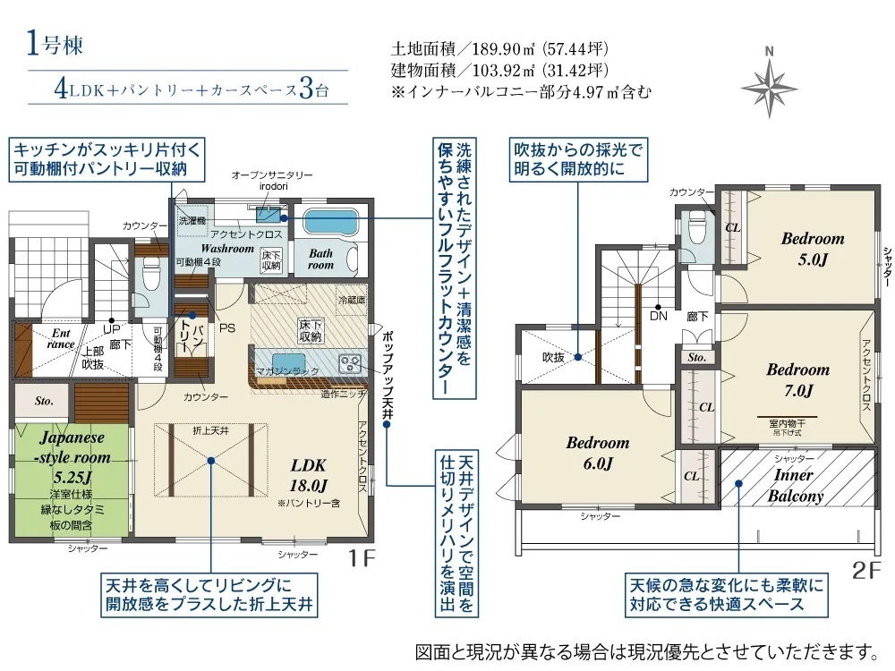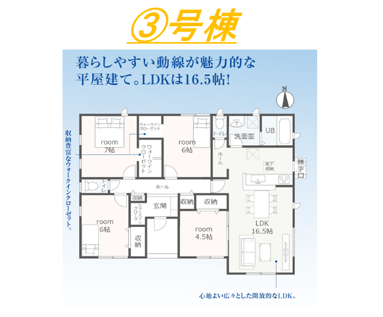 ・対面式キッチン・住宅性能表示W取得・耐震等級3・浴室暖房換気乾燥機・TVモニター付インターホン・ウォークインクローゼット・インナーバルコニー・パントリー・ストレージルーム・平屋建て