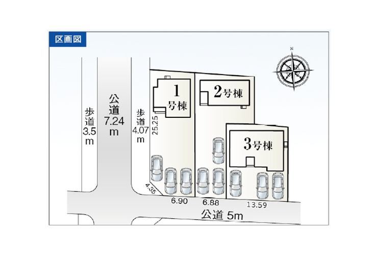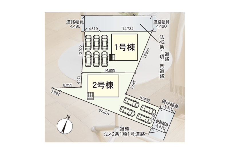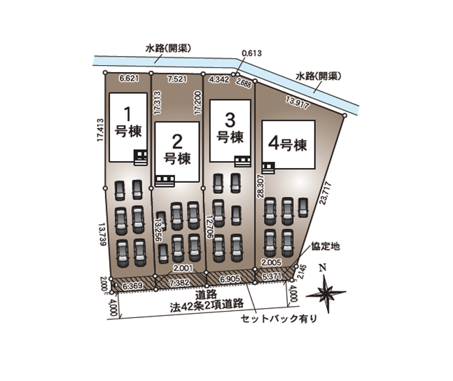 ◯所在地/静岡県浜松市中央区曳馬3丁目1076-8 ◯交通/遠州鉄道「助信」駅、徒歩11分 ◯総区画数/4区画 ◯販売棟数/4棟 ◯土地権利/所有権 ◯土地面積/172.91㎡・137.00㎡ ◯建物面積/104.75㎡~103.50㎡ ◯建築確認番号/第2024確認建築静建住ま11007号 ◯構造/木造2階建ガルバリウム鋼板葺 ◯都市計画/市街化区域 ◯用途地域/第一種住居地域 ◯建ぺい率/60% ◯容積率/200% 設備/公営水道・中部電力・本下水・都市ガス ◯接道/北側6.0m ◯完成/2025年8月予定