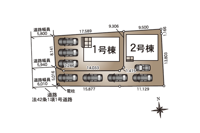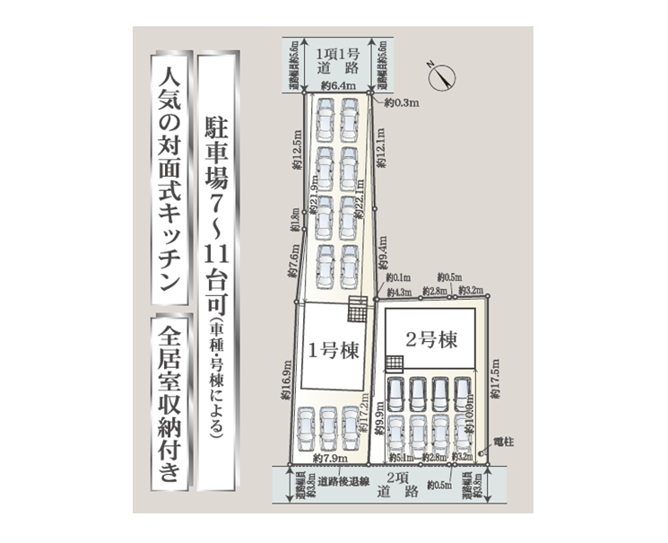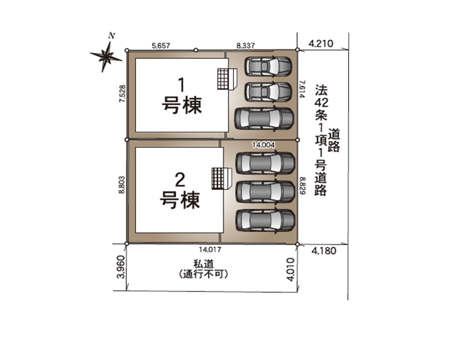 ◯所在地/静岡県浜松市中央区有玉西町2413-3 ◯交通/遠州鉄道「上島」駅、徒歩18分 ◯総区画数/2区画 ◯販売棟数/2棟 ◯土地権利/所有権 ◯土地面積/138.63㎡・138.64㎡ ◯建物面積/100.90㎡・101.16㎡ ◯建築確認番号/第R07SHC123313号他 ◯構造/木造サイディングシングル葺2階建て ◯都市計画/市街化区域 ◯用途地域/第一種住居地域 ◯建ぺい率/60% ◯容積率/200% 設備/公営水道・中部電力・都市ガス・本下水 ◯接道/北側7.6m・西側6.0m・南側5.9m ◯完成/2026年3月予定