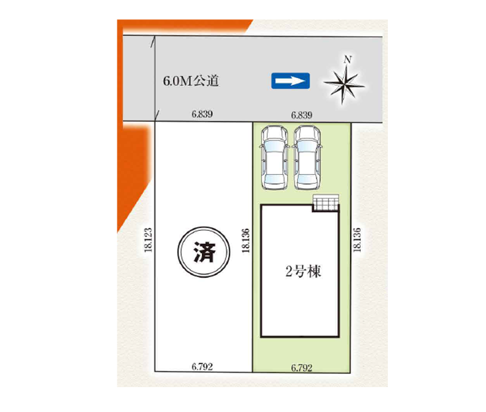 ◯所在地/静岡県浜松市中央区三和町736-2 ◯交通/JR東海道本線「浜松」駅、バス8分、バス停「西伝寺」徒歩7分 ◯総区画数/2区画 ◯販売棟数/2棟 ◯土地権利/所有権 ◯地目/宅地 ◯土地面積/160.76㎡・219.77㎡ ◯建物面積/111.79㎡・95.64㎡ ◯確認建築番号/第KS125-0420-55775号 ◯構造/木造在来軸組工法1階・2階建て ◯土地計画/市街化区域 ◯用途地域/第1種住居地域 ◯建ぺい率/60% ◯容積率/200% ◯設備/公営水道・中部電力・本下水・個別プロパンガス ◯接道状況/西側4.0m ◯完成/2025年12月予定