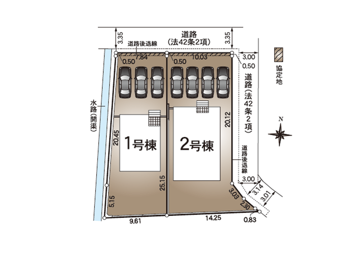 ◯所在地/静岡県浜松市中央区高丘北4丁目104-9 ◯交通/東海道本線「浜松」駅、バス23分、バス停「瑞穂橋」徒歩5分 ◯総区画数/2区画 ◯販売棟数/2棟 ◯土地権利/所有権 ◯土地面積/161.84㎡・156.78㎡ ◯建物面積/99.78㎡・106.82㎡ ◯建築確認番号/第KS125-0420-60812号 ◯構造/木造2階建ガルバリウム鋼板葺 ◯都市計画/市街化区域 ◯用途地域/準工業地域 ◯建ぺい率/60% ◯容積率/200% 設備/公営水道・中部電力・都市ガス・本下水 ◯接道/東側6.0m ◯完成/2026年7月予定