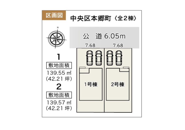 ◯所在地/静岡県浜松市中央区本郷町1323-7 ◯交通/JR東海道本線「浜松」駅、バス13分「本郷中」徒歩6分 ◯総区画数/2区画 ◯販売棟数/2棟 ◯土地権利/所有権 ◯地目/宅地 ◯土地面積/139.55・139.57㎡ ◯建物面積/110.96㎡・111.37㎡ ◯確認建築番号/第KS125-0420-57772号 ◯構造/木造在来軸組工法2階建て ◯土地計画/市街化区域 ◯用途地域/第2種中高層住居専用地域 ◯建ぺい率/60% ◯容積率/200% ◯設備/公営水道・中部電力・本下水・都市ガス ◯接道状況/北側6.05m ◯完成/2026年1月予定