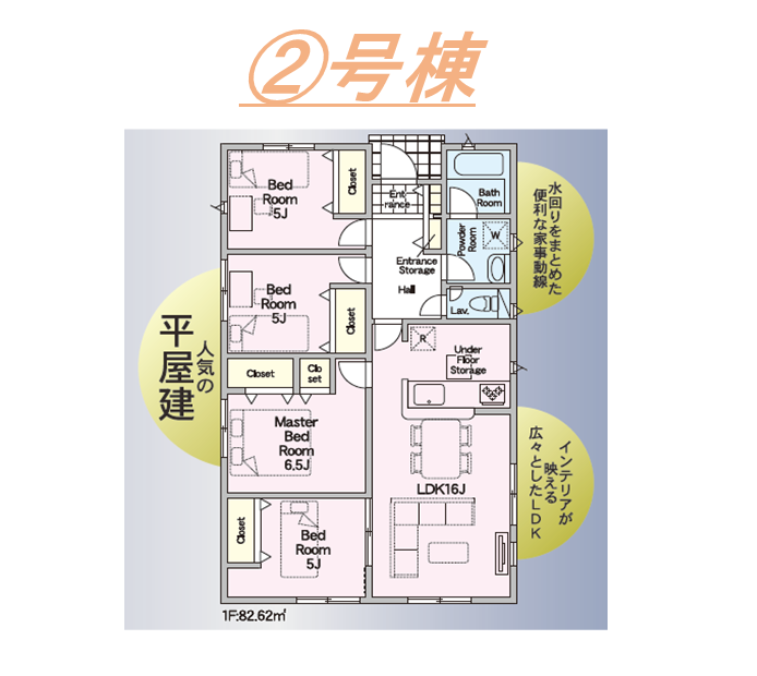 ・長期優良住宅・対面式キッチン・住宅性能表示W取得・耐震等級3・浴室暖房換気乾燥機・TVモニター付インターホン・ウォークインクローゼット・平屋建て