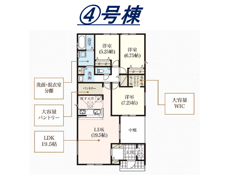 対面式キッチン・住宅性能表示W取得・耐震等級3・浴室暖房換気乾燥機・TVモニター付インターホン・ウォークインクローゼット・土間収納・フリースペース・中庭