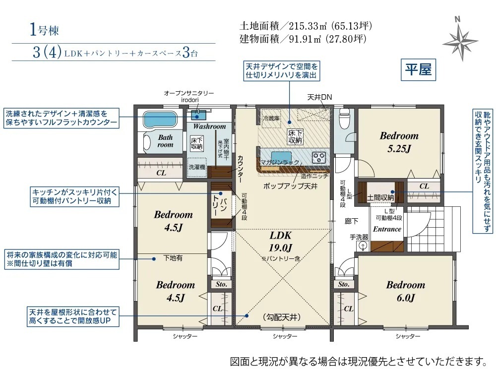 設計性能評価・耐震等級3・ビルトイン食洗機・ウォークインクローゼット・シューズinクローク・ポップアップ天井・ポップアップ天井・土間収納