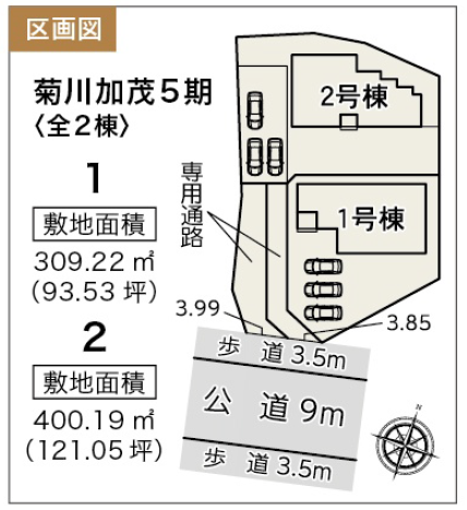 ◯所在地/静岡県菊川市加茂5436他 ◯交通/JR東海道本線「菊川」駅、バス9分、バス停「東名菊川」徒歩4分 ◯総区画数/2区画 ◯販売棟数/2棟 ◯土地権利/所有権 ◯地目/宅地 ◯土地面積/151.87㎡・150.90㎡ ◯建物面積/98.81㎡・95.98㎡ ◯建築番号/第R07SHC113999号他 ◯構造/木造スレート葺又はアスファルトシングル葺ガルバリウム鋼板横葺2階建て ◯都市計画/非線引き区域 ◯用途地域/第一種住居地域 ◯建ぺい率/60% ◯容積率/200% 設備/公営水道・中部電力・個別プロパンガス・本下水 ◯接道/南側7.9m ◯完成/2026年1月予定